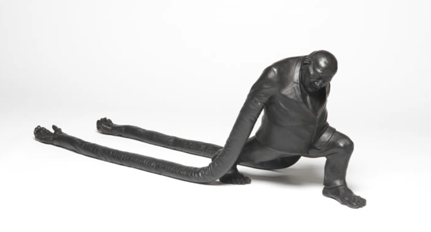 Martin Spei‘s characters, the little capitalists, carrying a case sometimes, barefoot and with bunions, speak of America’s trademark, the commercial culture. In Train, the arms are so heavy, they stretch and extend backward. The little guy, as a Sisyphus without a globe, carries his body instead as that burden of heaviness, having to lounge widely before each step. “What I find appealing about the capitalists is the representation of love of capital in the form of these ponderous and somewhat cuddly, elephantine gentlemen. I don’t actually have this love of capital myself. All characters are on the same morphological pattern and each carries this enigmatic red case in quest of his own destiny. Their sumo-like bodies dressed in business suits are meant to symbolize contemporary individuals in a prosperous society.” Train is made of cast bronze and leather.